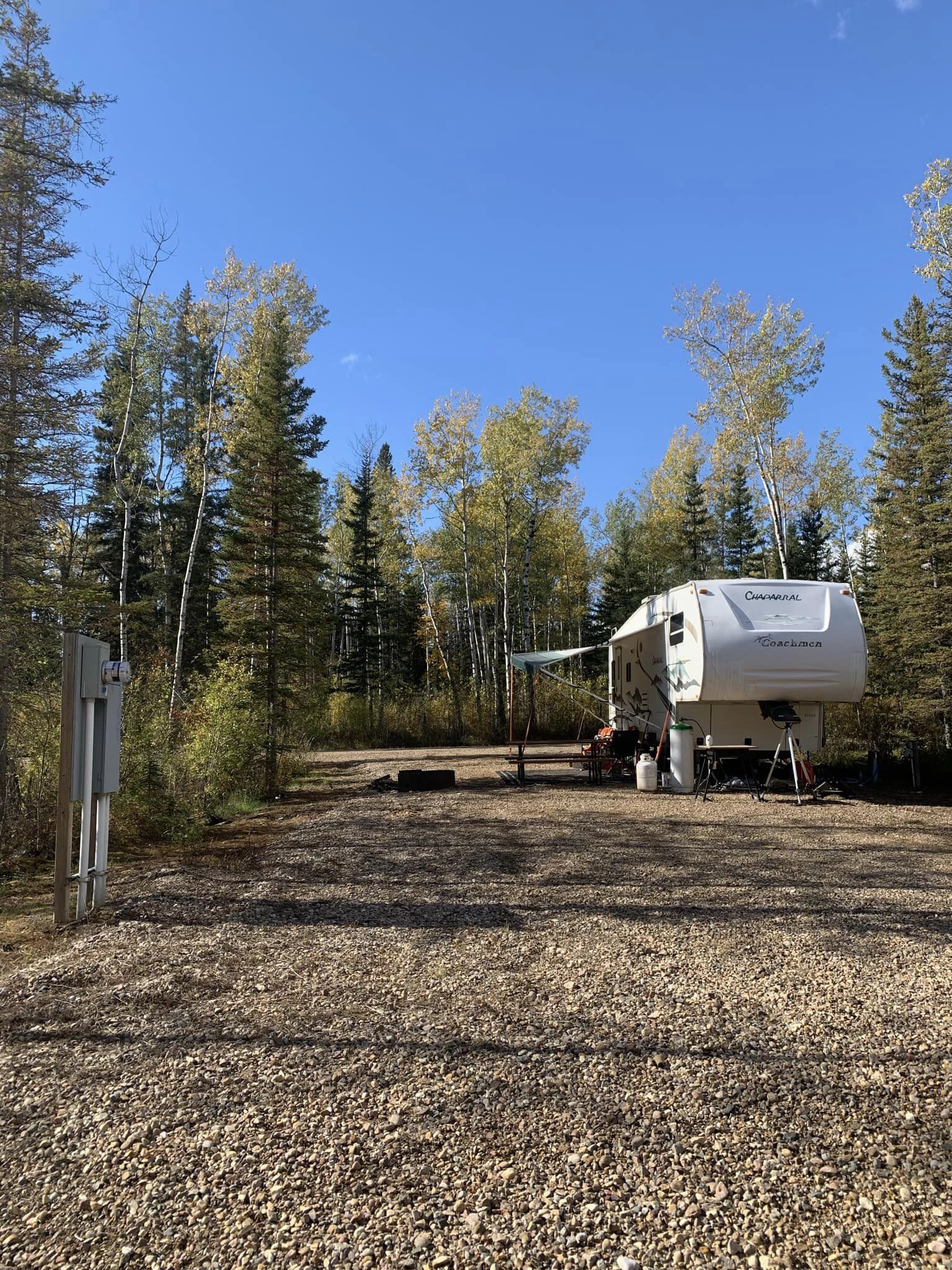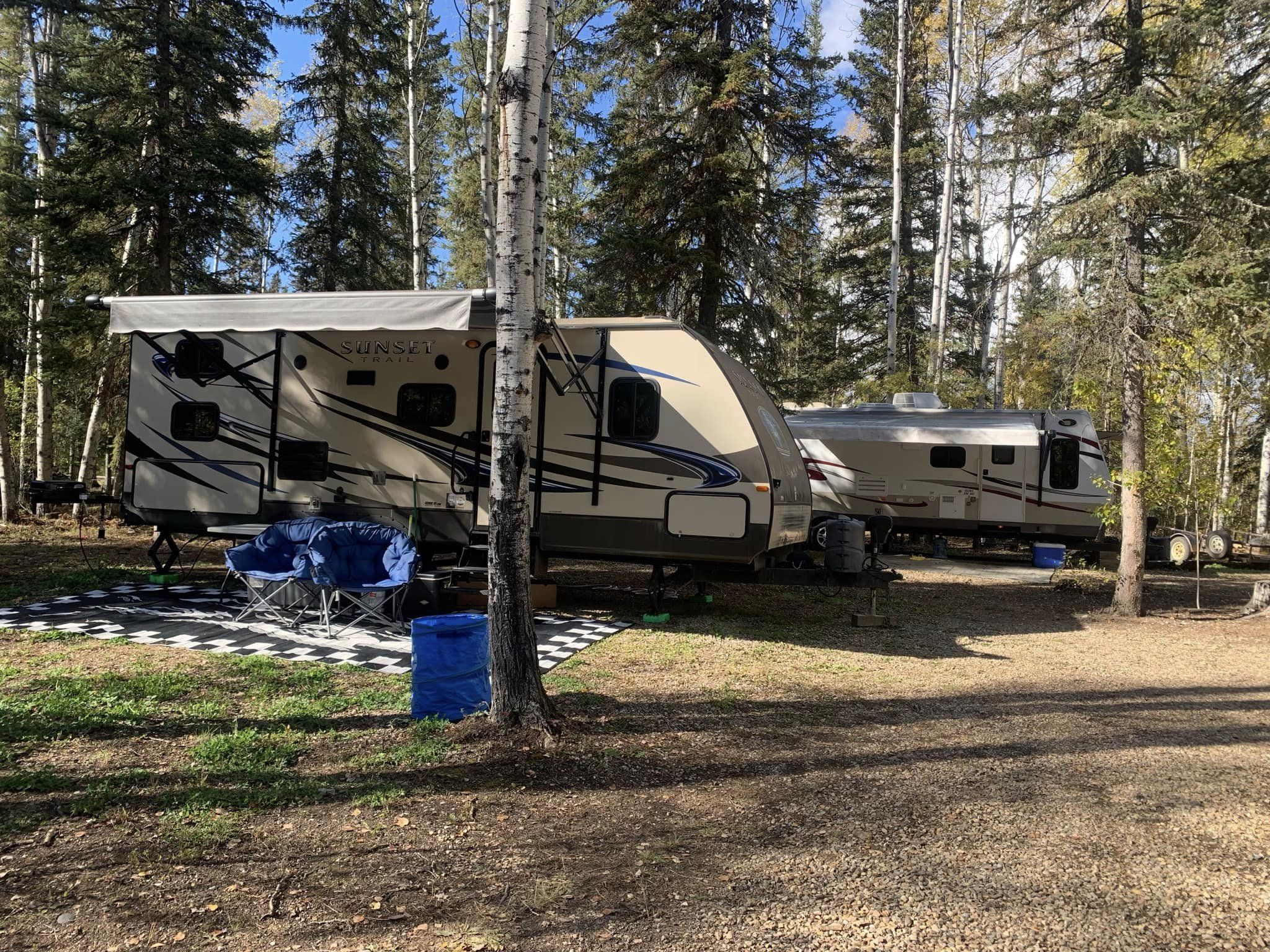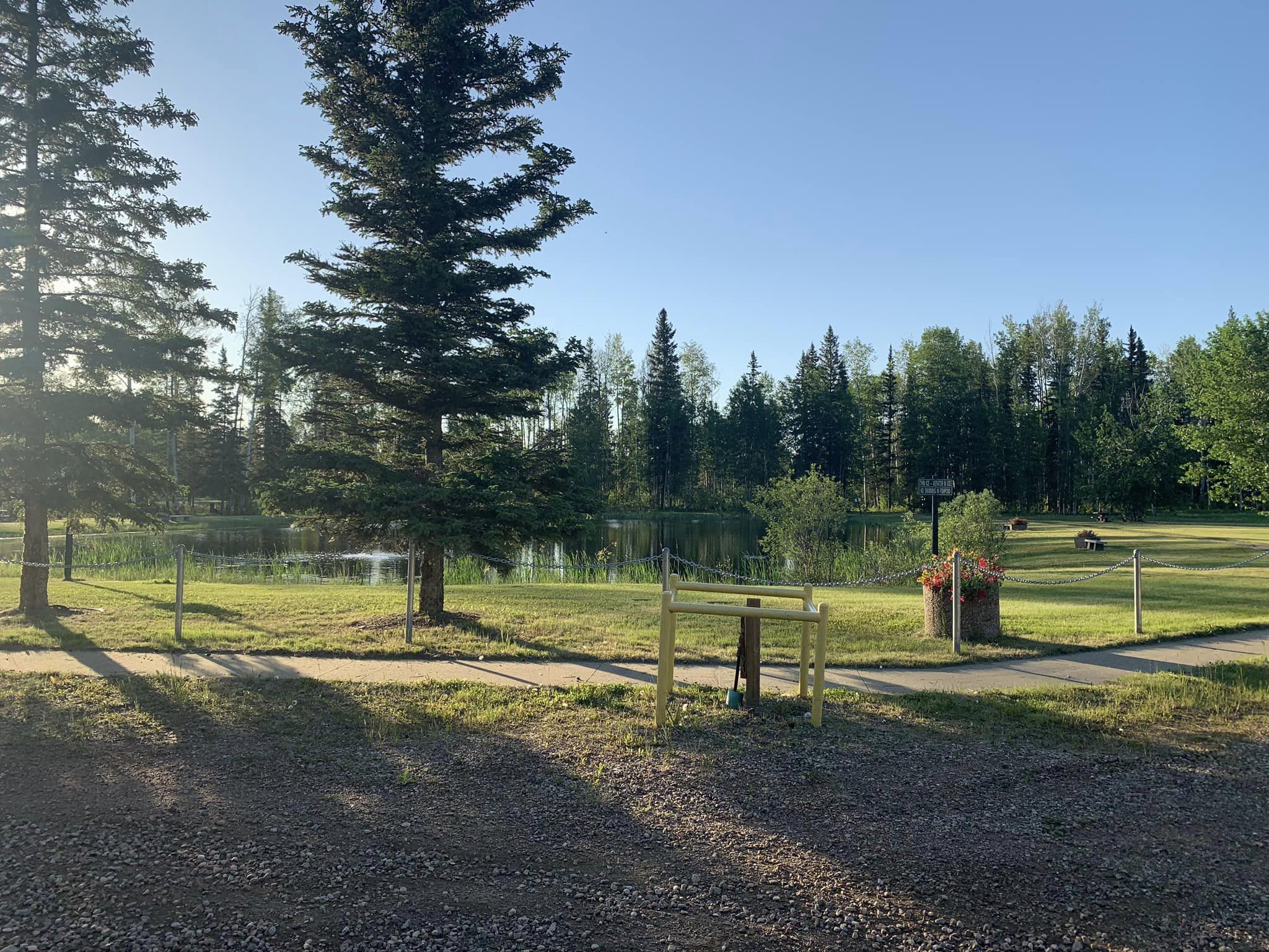 We are an ATV friendly community, so feel free to bring your machines and explore the area. Coin (loonie) operated showers, laundry (2025) playground, horseshoes, picnic shelter, Alberta’s most northern disc golf course (listed on udisc.com). We have two types of sites available… more intimate back-in treed full-serviced sites, larger drive through full-serviced full serviced sites with lots of room to park.