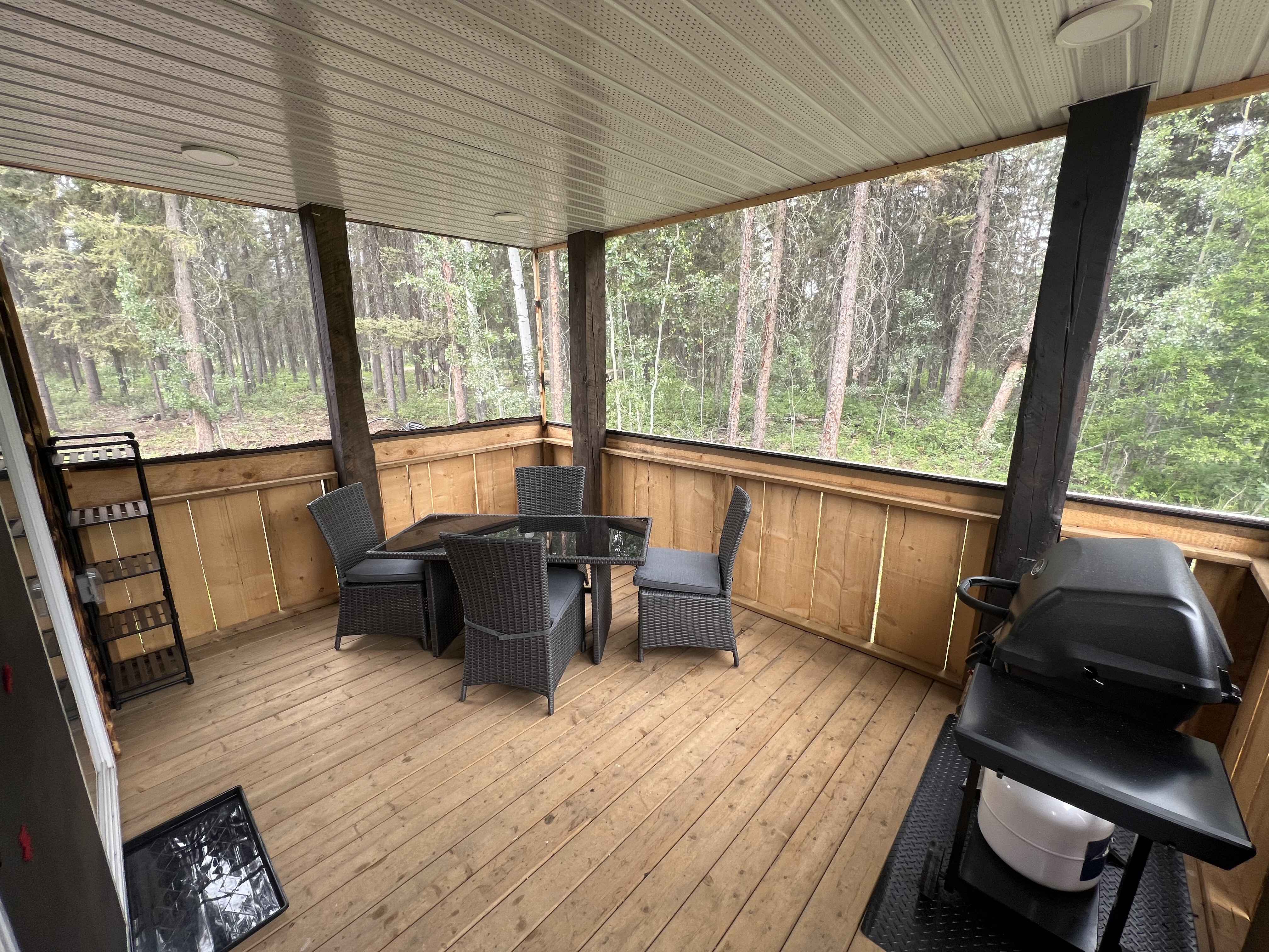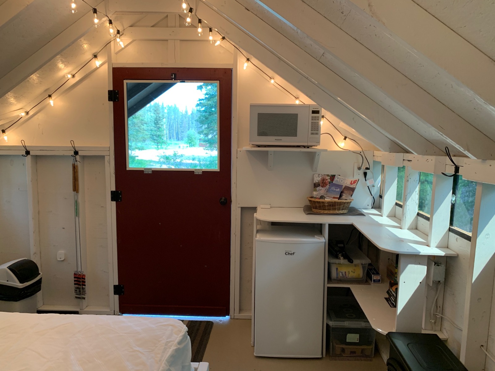 Complete with power, a queen size bed with pillow top mattress, mini-fridge, microwave, Keurig Coffee maker, electric fan and heater and a BBQ w/burner on the deck!
